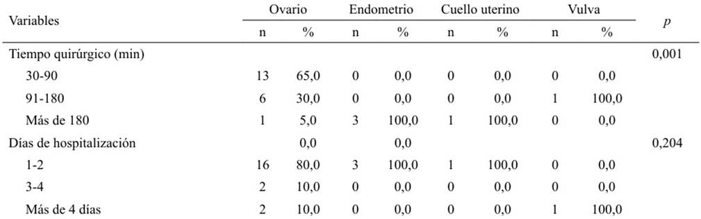 En la Tabla 7 se presenta la información sobre el tiempo quirúrgico y los días de hospitalización. En neoplasias ováricas, 13 casos (65 %) ameritaron entre 30 y 90 minutos. Seis casos de cáncer de ovario (30 %) y el único con cáncer de vulva, requirieron entre 91 y 180 minutos. Finalmente, en un caso de ovario (5 %), en los tres casos de endometrio (100 %) y en el caso de cuello uterino (100 %), las intervenciones duraron más de 180 minutos.