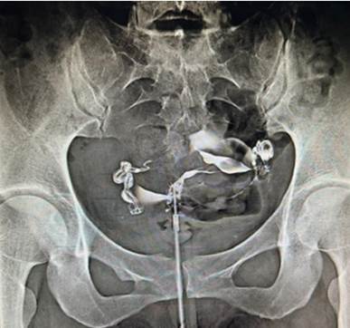 Figura 1 imagen de histerosalpingografía de la paciente del caso 1. Se destaca la imagen arrosariada, especialmente de la trompa izquierda. El Cotte es positivo, bilateral, con barrido trabecular irregular.