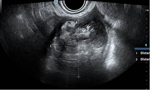 Figura 1 Ovario derecho con imagen ecomixta, predominantemente sólida, redondeada, bordes regulares de 67 x 64 mm.