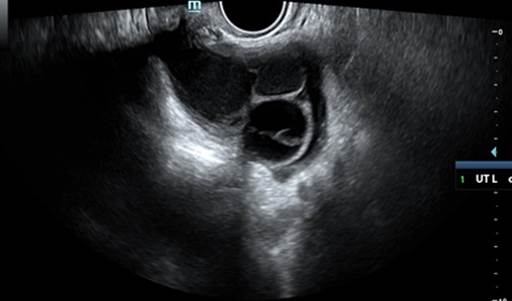En la exploración física, los hallazgos pertinentes en el tacto bimanual: vagina normotérmica, normotónica, cérvix renitente, de bordes lisos y regulares no doloroso a la movilización. Útero en anteversoflexión, intrapélvico, en fondo de saco vesico-uterino, se palpó tumoración móvil, redondeada de bordes regulares, a 3 cm de la sínfisis del pubis, de 8 x 5 cm, aproximadamente.