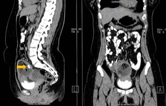 Figura 4 Tomografía axial computarizada en corte sagital y coronal donde muestra lesión ocupante de a nivel anexial izquierdo de aspecto quístico, de rango líquido, tabicada, con paredes delgadas (flecha).