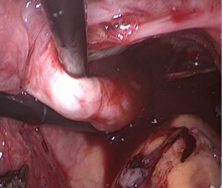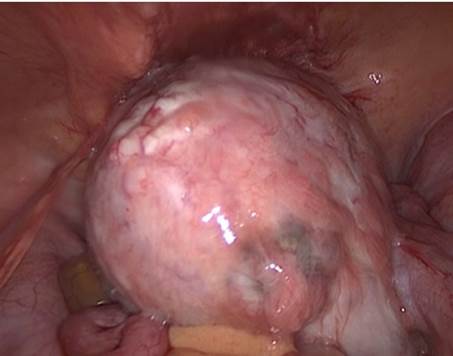 Se realizó exploración laparoscópica, con abordaje de 4 puertos, constatando los siguientes hallazgos: tumor de ovario derecho de aproximadamente 7 x 6 cm, cuya cara anterior estaba en relación con la vejiga (Figura 5). Superficie peritoneal con edema, eritema y aumento de la vascularización. Además de tumoración quística en ovario izquierdo de aproximadamente 5 x 4 mm.
