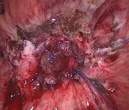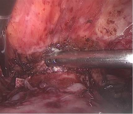 Posterior a adherensiólisis, se evidenció solución de continuidad en comunicación con vejiga, que permitió la aspiración del contenido del sugestivo teratoma (Figura 6). Se realizó ooforosalgingectomía derecha con extracción de la lesión in bag a través de puerto de 10 mm; cistectomía parcial y reparación de vejiga (Figura 7). Se realizó tumerectomía de lesión en ovario izquierdo, con rotura y evidencia de salida de contenido achocolatado, extrayendo la cápsula de la misma (Figura 8).