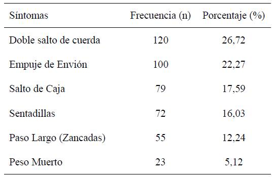 Se solicitó a las mujeres encuestadas que determinaran la presencia de otros síntomas asociados durante su entrenamiento. Se observaron ocho tipos de síntomas, distribuidos en la tabla 3 según su frecuencia. Destacan la pérdida de orina en un 93,3 % (112 mujeres) y la sensación de peso o bulto vaginal en un 44,1 % (53 mujeres). Otros síntomas fueron la amplitud vaginal (27,5 %), la micción incompleta (20 %), la expulsión de orina durante el coito (15 %) y dolor y excitación durante el entrenamiento (1,6 % cada uno). En la totalidad de la muestra (120 mujeres) no existió alteraciones en su desempeño sexual y en la presencia de orgasmos.
