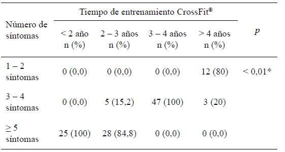 Se planteó determinar la cantidad de síntomas agregados durante el transcurso de los años de entrenamiento, las mujeres se dividieron según los años de entrenamiento en menos de 2 años de ejercicio, con 25 mujeres (20,8 %), 2 a 3 años de ejercicio con 33 mujeres (27,5 %), posteriormente el mayor grupo de mujeres (47 mujeres) se encontró entrenando de 3 a 4 años (39,1 % de la muestra) y, por último, solo 15 mujeres tenían más de 4 años de entrenamiento (12,5 % de la muestra). En la tabla 4 se puede observar que las mujeres con mayor trayectoria tenían menos síntomas asociados a la disfunción de piso pélvico (más de 4 años de entrenamiento: 80 % con 1 a 2 síntomas agregados), en cambio las personas con menos trayectoria tenían más síntomas (menos de 2 años: 100 % padecían 5 síntomas o más), con una correlación bilateral significativa (p < 0,01).