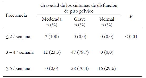 Tabla 5 Gravedad de los síntomas de disfunción de piso pélvico según la frecuencia de entrenamiento durante la semana