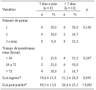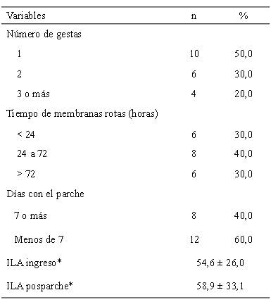 En la tabla 1 se presentan las características generales de las pacientes y su comportamiento con el parche autólogo. Un 50 % de las gestantes eran primigestas. El 40 % de las pacientes presentó la rotura de membrana entre 24 a 72 horas antes del tratamiento (media: 54,4 ± 45,9 horas). Luego de aplicarse el PEABPRP, se pudo prolongar el embarazo 7 días o más en 40 % de los casos. El valor promedio fue de 10 días, sin embargo, este dato estuvo afectado por una paciente que pudo prolongar el embarazo por 54 días, constituyendo esto un dato atípico que desvió el promedio hacia valores altos; la mediana de prolongación del embarazo con el parche fue de 3 días, lo cual coincide con la agrupación porcentual mostrada en la tabla 1. El índice de líquido amniótico (ILA) al ingreso fue de 54,6 ± 26,0 y posterior a la aplicación del parche fue de 58,9 ± 33,1; 4 mm por encima del ILA al ingreso, lo cual no resultó ser diferente a nivel estadístico.