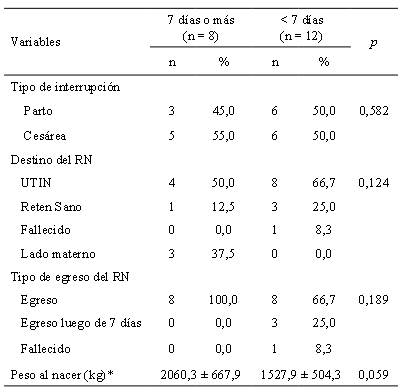En la tabla 2 se presentan las características posnatales de las pacientes evaluadas. A la mayor parte de las embarazadas (55 %) se les finalizó el embarazo por cesárea. Con respecto a los neonatos, 60 % fueron ingresados en la unidad de terapia intensiva neonatal (UTIN) por protocolo de riesgo infeccioso, para observación, pruebas de laboratorio y monitorización estricta; el mayor porcentaje de los recién nacidos (80 %) egresaron sin complicaciones en un plazo menor a 7 días; mientras que 1 recién nacido (5 %) falleció. El peso promedio al nacer fue 1740,9 ± 623,0 gramos.