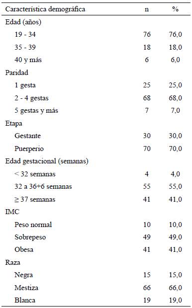 Las características demográficas de las pacientes se presentan en la tabla 1. La mayor frecuencia de pacientes, 76 (76,0 %), tenía entre 19 y 34 años; hubo 68 (68,0 %) pacientes que tenían entre 2 y 4 gestas. En 41 (41,0 %) casos las pacientes estaban a término.