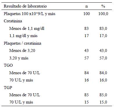 La distribución de pacientes según las alteraciones de laboratorio se puede observar en la tabla 3. Diecisiete (17,0 %) pacientes tenían la creatinina en 1,1 mg/dl o más, y la relación plaquetas /creatinina fue menor de 3,2 en 43 casos (43,0 %) y de 3,2 o más en 57 (57,0 %) pacientes. La transaminasa glutámico-oxalacética (TGO) estuvo al doble del valor normal en 16 (16,0 %) pacientes y la transaminasa glutámico-pirúvica (TGP) en 15 (15,0 %) pacientes.