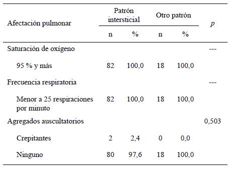En la tabla 6 se observa que no hubo asociación entre la afectación pulmonar y el patrón intersticial, con todas las pacientes presentando saturación de oxígeno de 95 % o más, y frecuencia respiratoria menor a 25 rpm. Solo dos pacientes (2,4 %) con patrón intersticial presentaron crepitantes (p = 0,503).
