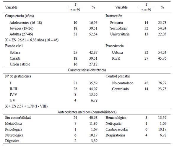 La tabla 1 muestra las características sociodemográficas, observándose que el grupo etario más frecuente fue de 27 a 46 años con 52,54 %, edad mínima 16 años y máxima 46 años, promedio 26,61 ± 6,88. Predominó la educación secundaria con 54,24 %, el estado civil unión en pareja 57,53 % (casadas 30,51% y unión estable 27,12 %) y el 54,24 % eran de procedencia urbana. Con relación a las características obstétricas 44,07 % tenían de II-III gestaciones, con X ± ES 2,57 ± 1,78 gestas (mínima I - máxima VIII) y el 76,27 % de los embarazos sin control prenatal. Respecto a los antecedentes de comorbilidades, se registraron 35 diagnósticos (59,32 %); entre ellas, hematológica (anemia) y metabólica (diabetes y obesidad) con 13,56 % y 11,86 % respectivamente.