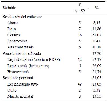 Al caracterizar la resolución del embarazo 61,02 % fue por vía cesárea, 11,86 % por parto vaginal y 6 pacientes se dieron de alta aun embarazadas. Se realizaron 23 procedimientos quirúrgicos, que incluyeron legrados uterinos, reintervenciones por hematomas sub- aponeuróticos/abdominal e histerectomías. En cuanto a los resultados perinatales 83,05 % de las pacientes tuvieron recién nacidos vivos (tabla 3).