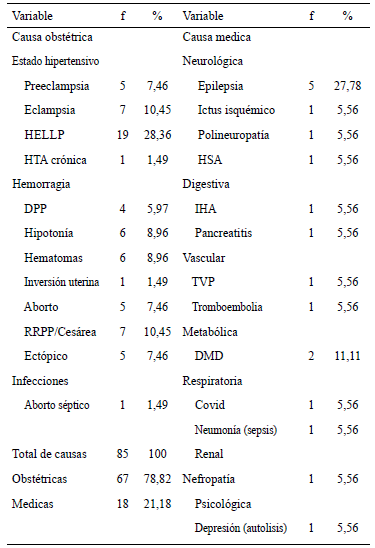 HELLP: hemólisis, elevación de enzimas hepáticas, trombocitopenia; HTA: hipertensión arterial; DPP: desprendimiento prematuro de placenta; RRPP: retención de restos posparto; HSA: hemorragia subaracnoidea; IHA: Insuficiencia hepática aguda; TVP: trombosis venosa profunda; DMD: diabetes mellitus descompensada;