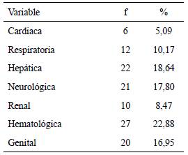 En cuanto a los criterios OMS para calificar la mujer con MME, también incluyen la identificación de una falla o disfunción orgánica, que se puede diagnosticar a través de marcadores clínicos objetivos, paraclínicos (laboratorio) o intervención aplicada (falla cardiaca, respiratoria, hepática, neurológica, renal, hematológica y genital). En esta casuística, se diagnosticó falla hematológica, seguida de falla hepática en similares proporciones y según el manejo específico de dichas fallas, se cumplió transfusión, uso de sustancias vasoactivas y manejo quirúrgico. Estos hallazgos, coinciden con reportes de investigaciones que exponen las fallas hematológicas asociadas a hemorragias y a la afectación hepática, que llevan al uso masivo de hemocomponentes y sustancias vasoactivas, así como su asocian a intervenciones quirúrgicas para abordar la causa que originó la MME 18,21,28.