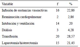 Al describir las condiciones de salud de las pacientes al ingresar a la institución, 83,05 % estaban delicadas con criterio de ingreso a UCI. Hay que tomar en cuenta que la institución es un centro de referencia para gestantes en críticas condiciones de salud. Por su parte, Rodríguez y cols. 18, en Cumaná, (Venezuela), comunicaron 17,83 % de pacientes con MME que ameritaron ingreso a UCI. Por otra parte, el 50,84 % fueron asistidas durante el periodo gestacional (anteparto), con una la resolución vía cesárea en 61,02 % debido a compromiso materno/fetal y se debe destacar que 6 pacientes egresaron embarazadas. Se realizaron 23 procedimientos quirúrgicos y este alto número de procedimientos fue en busca de estabilizar hemodinámicamente a la mujer debido a pérdidas hemáticas.