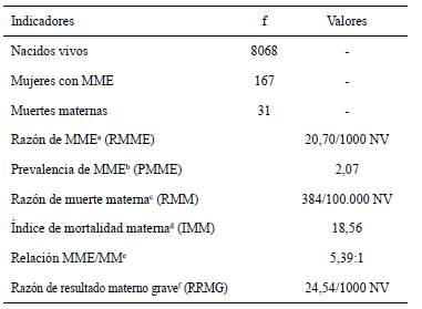 Durante el periodo de estudio se registraron 8068 nacimientos vivos (NV) y al evaluar los indicadores para medir los resultados de la salud materna, se obtuvo que la razón de MME (RMME) fue de 20,70/1000 NV. Por lo que se estima que la mujer tiene el riesgo de presentar una complicación grave a causa de problemas relaciones con el embarazo, parto y posparto de 20,70 casos por cada 1000 nacimientos. La OMS estima como esperable a nivel mundial, de 3 a 15 casos por cada 1000 nacimientos y en países desarrollados de 3,8 a 12 casos. La prevalencia de MME (PMME) fue de 2,07 %, expresando se presentan 2 casos de MME por cada 100 nacimientos 10,12. La razón de MM (RMM) se estimó en 384/100 000 NV. La OMS viene observando desde el año 1985 un descenso progresivo, hasta el 2020, y la estimación a nivel mundial para 2020 fue de una razón de 223 (202 - 255) en el número de muertes maternas por cada 100 000 nacidos vivos, para América, de 68 y para Venezuela de 259 29. El índice de mortalidad materna (IMM) expresa que pueden morir 18,56 mujeres por cada 100 nacimientos y la relación MME/MM fue de 5,39:1 estimando que hay 5 MME por cada caso de muerte materna.