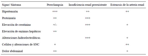 Cuadro 1 Frecuencia en los signos y síntomas entre las causas de hipertensión de origen renal y preeclampsia.