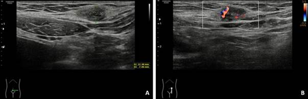 Figura 1: Ecografía en modo B y ecografía power-doppler. A) En el tejido celular subcutáneo de la pared abdominal, ligeramente por encima del ligamento inguinal izquierdo y adyacente a la cicatriz de cesárea previa, se visualiza un nódulo de ecogenicidad heterogénea, predominantemente hipoecoico, de contorno irregular. B) Presenta aumento de vascularización en doppler, con vasos con flujo de alta resistencia en doppler pulsado.