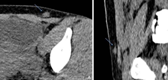 Se realizó ecografía y tomografía computarizada (TC) en Valsalva, donde se apreció pequeño saco herniario supraumbilical de 1,1 cm, sin más defectos fasciales ni sacos. En el tejido celular subcutáneo de la región inguinal izquierda, se observó un nódulo hiperdenso de 2 cm que se definió como foco de endometriosis en pared. Los ovarios eran globulosos por endometriomas (Figura 1).