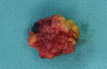 Se intervino quirúrgicamente con exéresis del nódulo umbilical bajo anestesia general, realizándose finalmente onfalectomía por imposibilidad de disecar la tumoración, separándola de la piel. También se realizó hernioplastia umbilical. La pieza se envió a anatomía patológica para estudio histopatológico, que reportó fragmento de piel umbilical en cuyo interior se identificó presencia de estroma endometrial hemorrágico sin atipia.