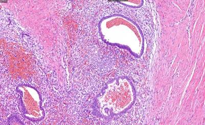Figura 4 HE 21x. Glándulas endometriales dilatadas, revestidas por epitelio cilíndrico, que contienen material hemático en su interior. También se observa material hemático extravasado en el estroma circundante.