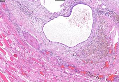 Figura 5 HE 10x. Tejido de músculo estriado (esquina inferior izquierda) próximo a glándulas endometriales dilatadas con material hemático en su interior (centro) y a histiocitos con hemosiderina (margen derecho).
