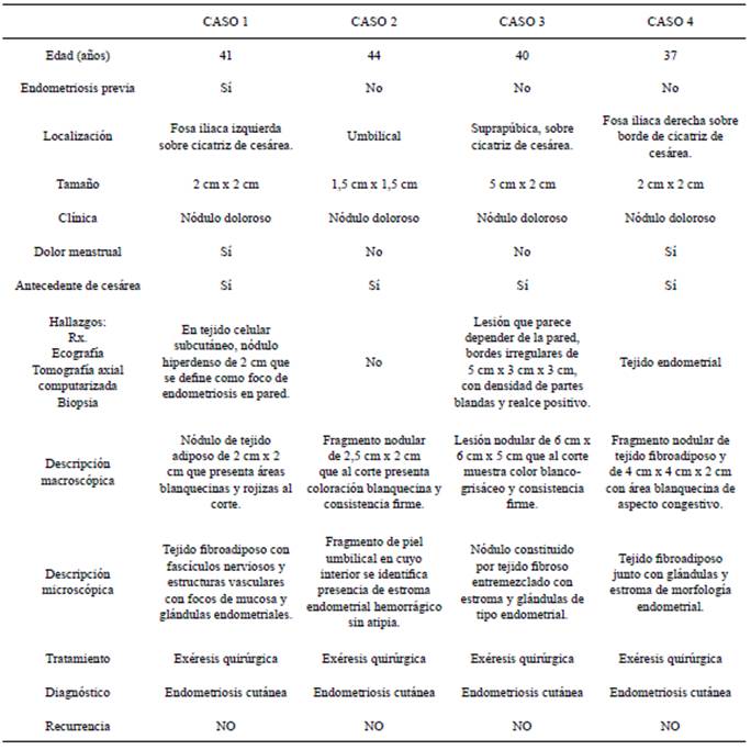 Se realizó un estudio retrospectivo descriptivo desde el 1 de enero de 2021 hasta el 31 de diciembre de 2023, siendo 4 las pacientes intervenidas en la unidad de cirugía mayor ambulatoria (CMA) de las tumoraciones de partes blandas, con diagnóstico de endometriosis cutánea, siendo el objetivo de este estudio. La edad media de las pacientes fue de 40 años, con un rango entre 37 y 44 años. A continuación, se presentan los casos.