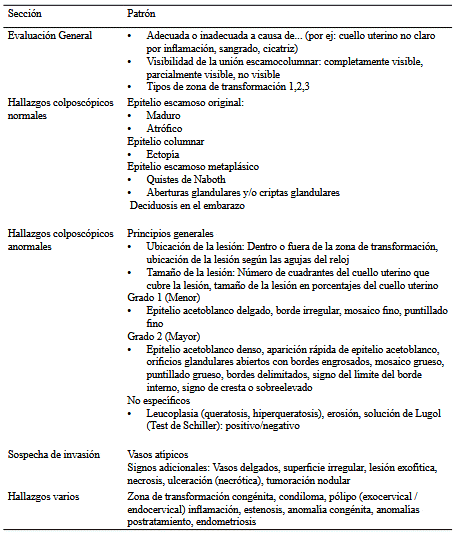 • i) La terminología recomendada para describir los hallazgos colposcópicos es la propuesta por la Federación Internacional de Patología Cervical y Colposcopia, en su última actualización presentada en Rio de Janeiro en 2011 (cuadro 1) (Nivel de evidencia alto, recomendación fuerte).