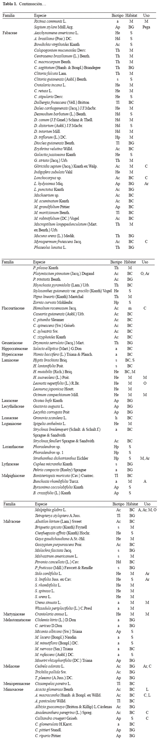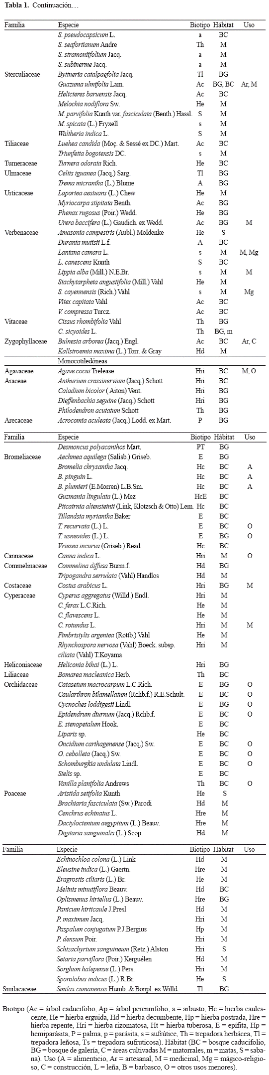 El resultado de las encuestas sobre el uso local de las plantas del área, complementado con observaciones directas, realizadas en conucos, sembradíos y construcciones rurales se muestran en la Tabla 1. Las principales aplicaciones registradas fueron: consumo alimenticio (32 especies), donde destacan todas las representantes del género Bromelia, especialmente B. chrysantha (maya), Eryngium foetidum (culantro), Calycolpus goetheanus (pajuí), Lycopersicon esculentum var. cerasiforme (tomate balita), Malpighia glabra (cereza), Mangifera indica (mango), Melicoccus bijugatus (maco), Passiflora serrulata (guaiqueruco), Spondias mombim (jobito) y Talisia oliviformis (cotoperí); medicinal (53 especies, 38,61% silvestres), principalmente contra problemas gastrointestinales, infecciosos, circulatorios y dermatológicos; para la construcción de galpones, casas, cercas y tutores de cultivos (27 especies) las especies más utilizadas son: Bulnesia arborea (palo sano), Caesalpinia coriaria (dividive), Tabebuia billbergii (puy) y Peltophorum acutifolium (durote); para fines artesanales emplean unas 19 especies, para elaborar sillas y mesas las más solicitadas son: Bourreria cumanensis (guatacare), Cedrella odorata (cedro), Cereus hexagonus (cardón) y Cordia alba (cautaro), para realizar tallas es muy apreciada Pseudobombax septenatum (murebe), para elaborar cabos para machetes y otras herramientas emplean Bourreria cumanensis, Bulnesia arborea, Cordia alba, Crescentia cujete (taparo) y Malpighia glabra; para leña son muy utilizadas Bourreria cumanensis, Acacia macracantha (yaque) y A. glomerosa (tiamo); con fines ornamentales se registraron 31 especies. Otros usos menores son como fumigantes, barbasco, envoltura de hojas de tabaco, juegos infantiles, pega para atrapar pájaros y para rituales místico-religiosos.
