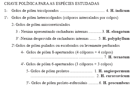 com três, seis e oito aberturas. Com relação à exina, observaram-se rachaduras na nexina de algumas espécies (H. elongatum e H. indicum); ornamentação variando de psilada a levemente escabrada e levemente perfurada a microrreticulada. Estes caracteres são considerados mais estáveis por não serem sujeitos a interferências do método de estudo, sendo assim mais confiáveis para aplicação em estudos de cunho taxonômico.