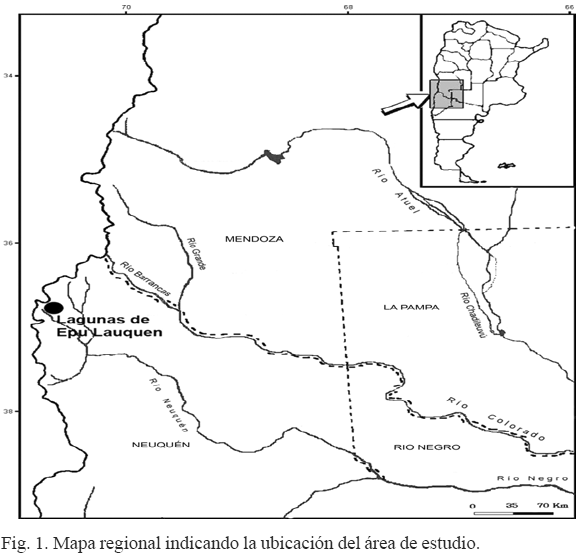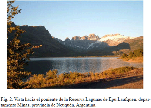 La Reserva Lagunas de Epu Laufquen fue creada en 1973 mediante el Decreto Ley Nº 748 del gobierno de la provincia de Neuquén (República Argentina) y cuenta con una superficie de 74,5 km2. Geográficamente se encuentra comprendida entre los 36º 58´ y 36º 40´ S y los 70º 53´ y 71º 15´ W, en los contrafuertes de la cordillera de los Andes (Fig.1) Está conformada por una serie de lagunas glaciares conectadas entre sí, conformando las cuencas altas de los ríos Nahueve y Lumabia (Belloti 2005) (Fig. 2).