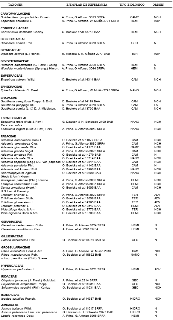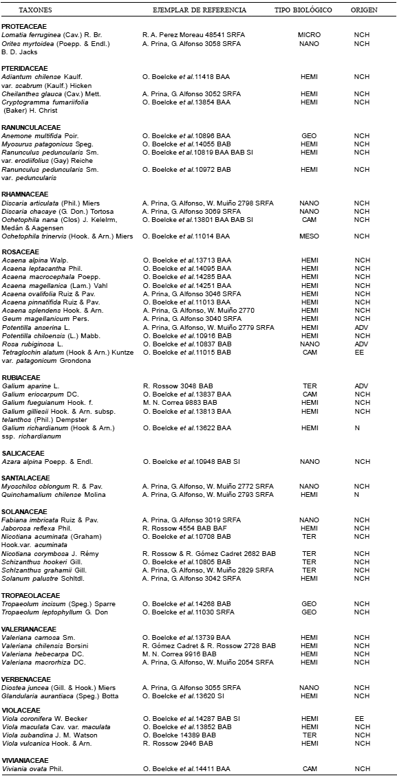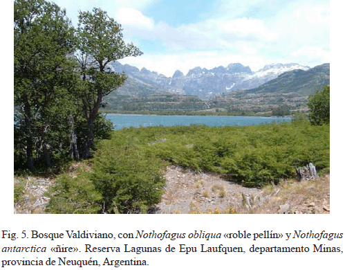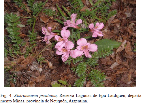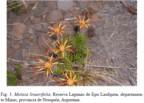 La flora vascular de la reserva está integrada por 329 taxones específicos e infraespecíficos correspondientes a 328 especies, 175 géneros y 65 familias (Tabla I). Las familias con mayor representación son Asteraceae, con 21 géneros y 68 especies, y Poaceae con 25 géneros y 45 especies. El género Senecio L. se destaca por presentar 17 especies; le siguen Adesmia DC., Calceolaria L. y Perezia Lag. En cuanto a los tipos biológicos, se hallaron 160 hemicriptófitos, 55 caméfitos, 45 terófitos, 26 nanofanerófitos, 20 geófitos, 10 hidrófitos, 6 caméfitos pulvinados, 4 mesofanerófitos, 2 epífitos y 1 microfanerófito. Para las categorías de origen geográfico, 287 taxones resultaron nativos no endémicos, de los cuales 221 son compartidos únicamente con Chile (NCH) y otros 66 se comparten con otros países además de Chile (N); eran 26 taxones adventicios (AD) y 16 endémicos de Argentina, de los cuales 8 se restringen en su distribución al noroeste de Neuquén (EE) mientras los 8 restantes son endémicos de Argentina en sentido amplio (EA) (Tabla I). Cabe destacar el bajo número de taxones adventicios, sólo el 13%, lo que constituye un indicador del buen estado de conservación del ecosistema. Las especies Azara alpina y Orites myrtoidea son exclusivas de las lagunas de Epu Laufquen en territorio argentino. Las especies citadas junto a otros taxones como Senecio pilquensis, Mutisia linearifolia (Fig. 3) y Alstroemeria presliana (Fig. 4) confirman la ingresión de Bosque Valdiviano en la Argentina. (Fig. 5). En cuanto a Berberis copahuensis, citada por Gandullo et al. (2004) como un endemismo exclusivo del Parque Provincial Copahue, se ha verificado su presencia en Epu Laufquen.