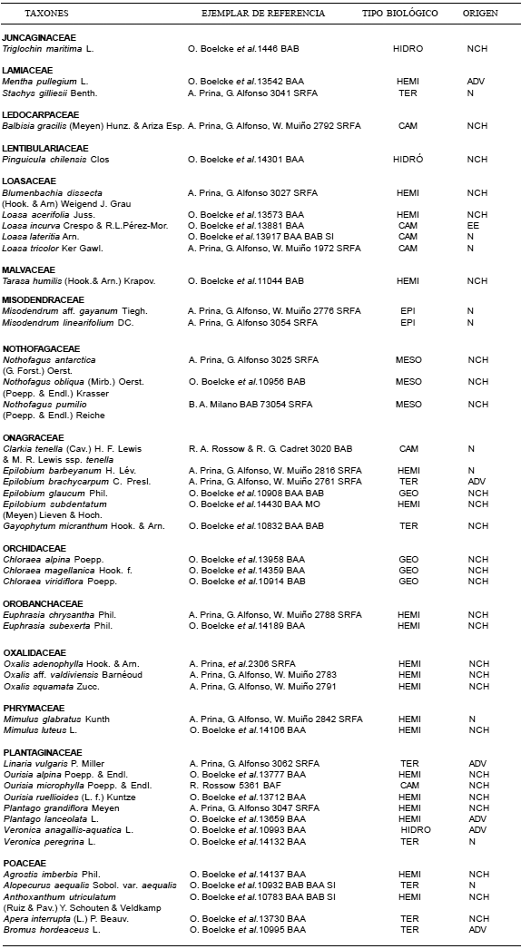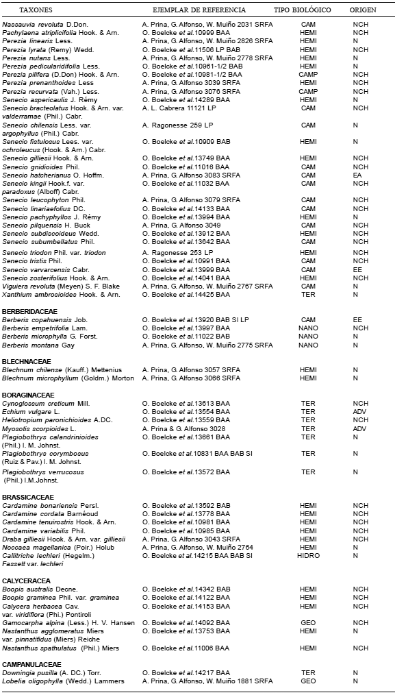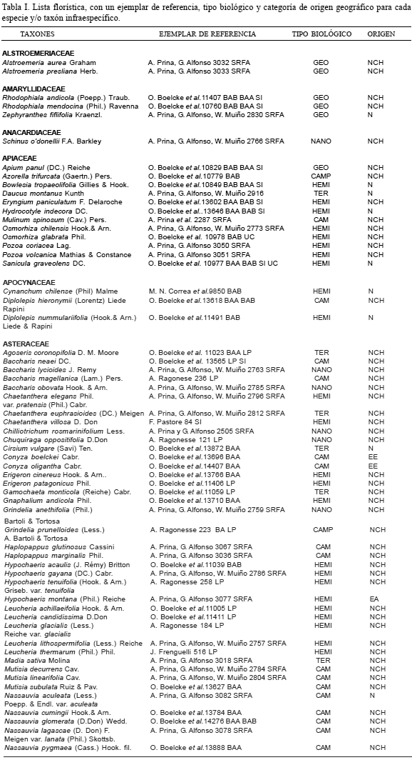 Los materiales utilizados en el presente estudio se obtuvieron a partir de colecciones propias llevadas a cabo entre las temporadas 2004-2006 que se encuentran depositadas en el herbario de la Facultad de Agronomía de la Universidad Nacional de La Pampa (SFRA), en algunos casos con duplicados en el Instituto de Botánica del Nordeste (CTES) y el Instituto de Botánica Darwinion (SI). Se consultaron además materiales de los herbarios de la Facultad de Agronomía de la Universidad de Buenos Aires (BAA), del Instituto Nacional de Tecnología Agropecuaria, Castelar, Buenos Aires, Argentina (BAB), especialmente las colecciones de O. Boelcke y colaboradores y del herbario del Museo de La Plata (LP). En algunos casos se apeló a citas bibliográficas, especialmente de Flora Patagónica (Correa 1969, 1971, 1978, 1984a, 1984b, 1988, 1998,1999) y diversos trabajos monográficos. Se procedió a la determinación y clasificación de los especímenes hallados y se efectuaron las actualizaciones nomenclaturales correspondientes de acuerdo a Zuloaga et al. (2008). Se clasificaron los taxones por su origen y por su tipo biológico según Raunkiaer (1934).