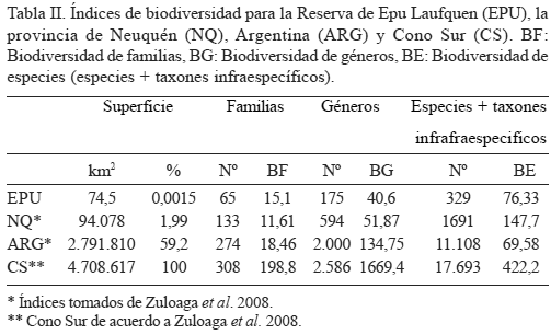 En la Tabla II se muestran los índices de biodiversidad del área de estudio y se los compara con los correspondientes para la provincia de Neuquén, para la República Argentina y para el Cono Sur, considerado este último de acuerdo a Zuloaga et al. (2008). Los valores obtenidos indican la relevancia florística del área. Si se comparan los índices de biodiversidad de especies y taxones infraespecíficos de Epu Laufquen con los del Cono Sur, se obtiene que en un área cuya superficie es de una milésima y media de la anterior, se registra una biodiversidad casi siete veces superior a la esperable por su tamaño.