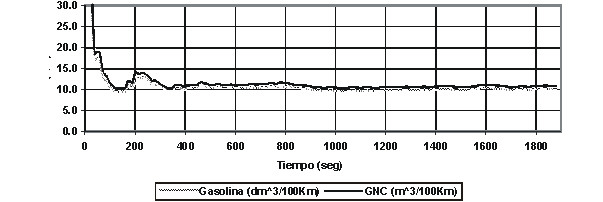 En la Figura 3 puede observarse el comportamiento del consumo de combustible en función del tiempo. Teniendo en cuenta que 1 dm3 de gasolina es energéticamente equivalente a 1 m3 de GNC, se observa que el requerimiento de energía usando GNC como combustible es mayor que con la gasolina. Adicionalmente, cuando se utiliza GNC como combustible el peso de los cilindros de almacenamiento incrementa el peso total del vehículo en un 10% aproximadamente, motivo por el cual los autores enuncian la disminución de la carga útil del vehículo al usar GNC, como una desventaja de la conversión [10].