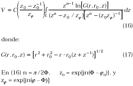 L es un contorno en el plano z equivalente al contorno g en el plano a. La integración en (16) se puede efectuar mediante la aplicación directa de la teoría de residuos, previa determinación de las raíces del denominador. Por ejemplo para 2F = p, n = 1, las raíces del denominador son simplemente z1 = zo/zj, z2 = (zo.zj). De acuerdo a la teoría de los residuos la solución de la integral (16) para este ejemplo en particular es la siguiente:
