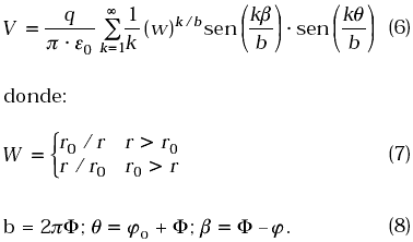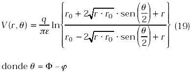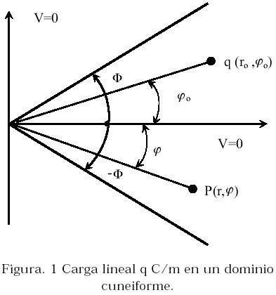 Sea una carga lineal con densidad de carga q C/m, ubicada en un punto (ro, jo) en un dominio cuneiforme tal como se muestra en la Figura 1. En la frontera del dominio, j = ±F se tienen dos planos conductores con voltajes de referencia V = 0. Se desea conocer el potencial VP en un punto P de coordenadas (r, j).