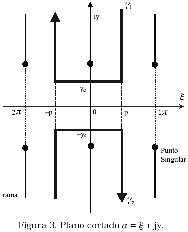 La función ln(R) es multivaluada en el plano complejo a = x + iy con polos en los puntos correspondientes a (13) y (14). Haciendo los cortes mostrados en la Figura 3, se evitan los múltiples valores de esta función y la función logarítmica pasa a ser una función monovaluada en el plano cortado.