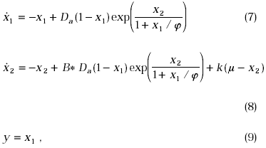 donde x1 y x2 son respectivamente, la concentración de reactante y la temperatura del reactor en forma adimensional. La entrada, m, es la temperatura del agua de enfriamiento en la chaqueta y los parámetros físicos Da, j, B y k se definen en la Tabla 1. Este sistema ha sido ampliamente estudiado por Ishida [10], Bequette [7], Arkun [8] y otros.