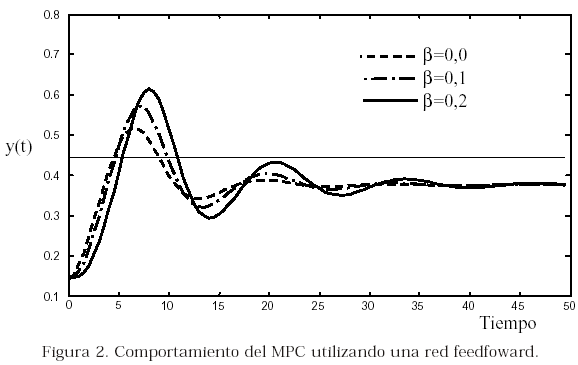 Al utilizar de forma concatenada en el algoritmo del MPC una red neuronal feedfoward, se observa error en el estado estacionario, el cual es independiente de la magnitud de la penalización en los cambios de las acciones de control. A medida que se aumenta b en (1) se observa un incremento en el sobreimpulso, esto es debido primordialmente a que los componentes dinámicos del sistema no son modelados óptimamente. El modelo neuronal presenta desviaciones en los componentes estáticos y dinámicos del proceso, afectando la estabilidad, como se puede observar en la Figura 2.