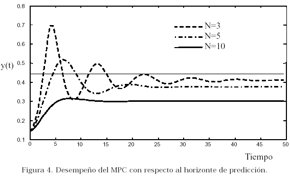 Cuando el modelo predictivo es perfecto, no se observa error en el estado estacionario, independientemente de la longitud del horizonte de predicción, obteniéndose solo un aumento en el tiempo de subida. Para el caso de utilizar modelos predictivos imperfectos, a medida que se incrementa el horizonte de predicción aumenta el error en el estado estacionario y el sobreimpulso disminuye. Intuitivamente se puede concluir que este aspecto se debe a la acumulación de errores durante la utilización de forma concatenada de los modelos predictivos imperfectos.