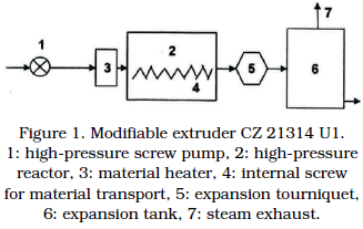 The operational tests were executed by varying reaction time (4, 6, 8, 10 and 12 minutes), variable hydro-module allowed to change dry weight in range from 5 to 25% and pressure (0,45, 0,9, 1,35, 1,8, 2,25, and 2,7 MPa, maximum construction limit 3,5MPa). Tests matrix can be understood from Table 1. Extrusion treatments were carried out on modifiable own-designed (CZ 21314 U1, Figure 1) device in work dimensions (300kg of material per hour). The hydromodule was set-up right in the moment processing due to technological limitations. That is why humidity in the operating mass was probed retrospectively. All obtained samples of extrudates were taken into polyethylene container and kept frozen until the CBGP simulations.