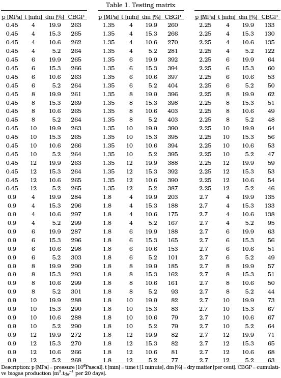 En el presente estudio se compararon las diferentes condiciones de reacción para el proceso de la extrusión (también conocido como explosión de vapor) del heno. Los experimentos de funcionamiento se llevaron a cabo en una extrusora continua y modificable con el fin de encontrar parámetros óptimos. El factor principal de la optimización fue la profundidad de la desintegración de material vegetal comprobada durante 30 días de la producción acumulada de biogás (CBGP). Los parámetros de la extrusión fueron retrasos en la extrusora, hydromodul y presión. La vinculación de los principios bioquímicos y los métodos matemáticos se han encontrado como las condiciones óptimas para el máximo rendimiento de la tecnología del biogás. La suposición de que el proceso de alta presión aumenta los rendimientos de biogás se confirmó sólo en determinadas áreas. Fueron modelados límites, en los que con la presión creciente los rendimientos de la producción de biogás disminyen, debido a la producción de los inhibidores del proceso anaerobio. Se demostró que las condiciones de proceso óptimo paragránulos (pellets) del heno se encuentran alrededor de presión 1,3 MPa, de tiempo de residencia en extrusora 7 minutos, 8% de materia seca. Obtenida extrusora crea 405 m3 biogás (52,3% CH4) por tonelada de materia seca.