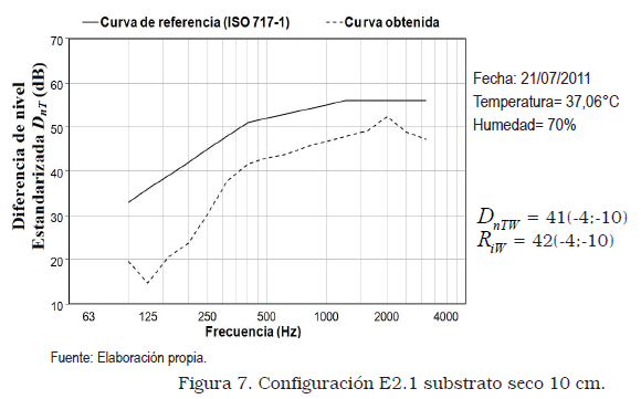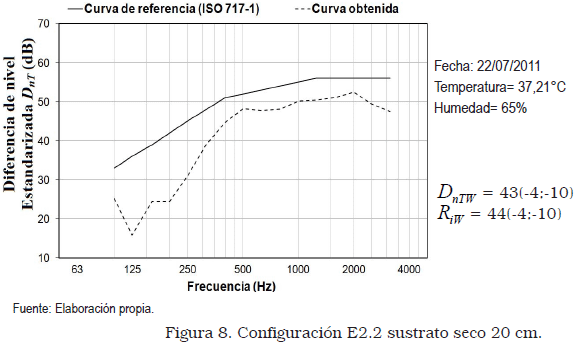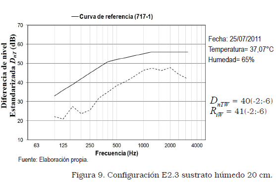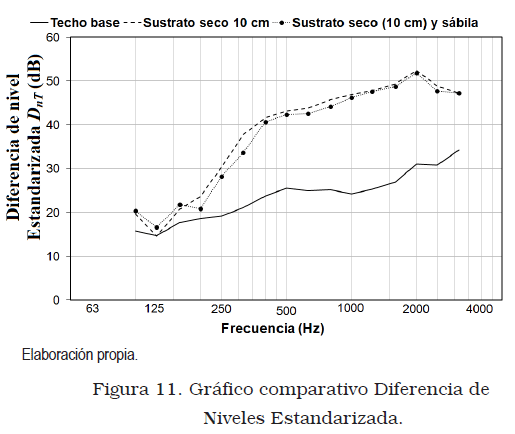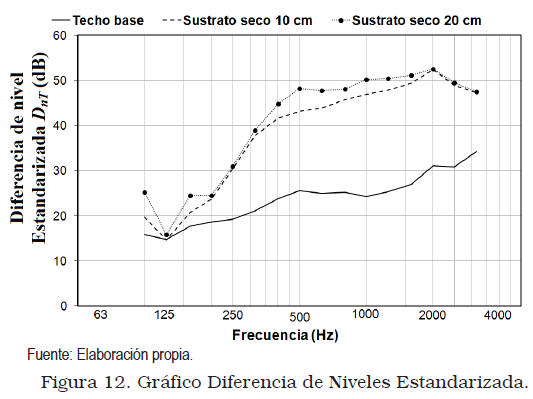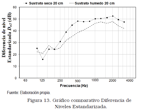 Comparando el valor global Ri del sustrato de 20 cm de espesor en las condiciones seca y húmeda, se observa que aísla 44 dB y 41 dB respectivamente, concluyéndose que el aislamiento disminuye cuando aumenta la humedad del sustrato. En la Figura 13 se compara la diferencia de nivel estandarizada para ambas condiciones donde a medida que aumenta la frecuencia del sonido mejora el aislamiento del techo.