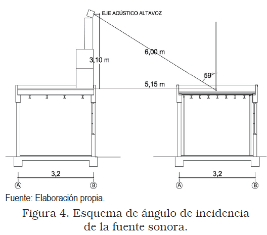 No existen normas para realizar ensayos de aislamiento acústico en techos, por lo tanto es necesario estudiar cuál debe ser la posición más representativa de la fuente sonora, este aspecto debe contemplar la distancia a la muestra y el ángulo de incidencia, de manera que minimice la pérdida de la energía sonora. La Norma Española ISO 140-5 para fachadas establece que la distancia entre la fuente y el centro de la muestra sea como mínimo 7 m y un ángulo de incidencia sonora de 45° ± 5°. En esta investigación, la distancia utilizada fue de 6 m y el ángulo de 59°. Se está realizando un estudio en distintas posiciones de la fuente sonora, para este tipo de ensayos con el fin de establecer cuál es la geometría más representativa para la ubicación del altavoz.