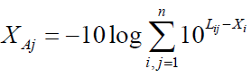 XAj Valor que se calcula a partir de los niveles Li j a la frecuencia i para el espectro j (Tabla 1), i el índice para la ubicación de los espectros por bandas de tercios de octava de 100 Hz a 3.150 Hz