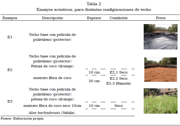 Se realizaron tres ensayos acústicos in situ, en la Figura 2 y Tabla 2 se observan los diferentes materiales utilizados en cada uno de ellos. Se vario el espesor y condición seca o húmeda del material ecológico sustrato de fibra de coco para determinar su aislamiento acústico; para ello se midieron los niveles de ruido de fondo exterior e interior del módulo. Se calcularon los valores promedio energético ( L1 y L2 ) por bandas de frecuencia central y el tiempo de reverberación promedio (Tr).