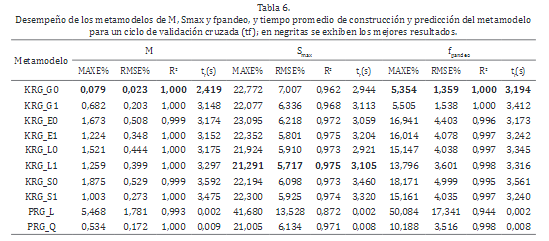Cuando consideramos los metamodelos de M y f pandeo , y S max , el mejor desempeño se obtiene utilizando el método Kriging con regresión constante (KRG_G0) y función de correlación Gaussiana (M y f pandeo ), y regresión lineal (KRG_L1) con función de correlación lineal (S max ); la Tabla 6 reporta los resultados obtenidos para las diferentes estrategias de metamodelado.