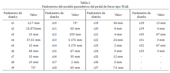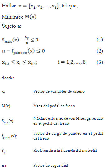 Dado un modelo de pedal de freno FSAE con un conjunto de variables y parámetros de diseño (Figura 1),